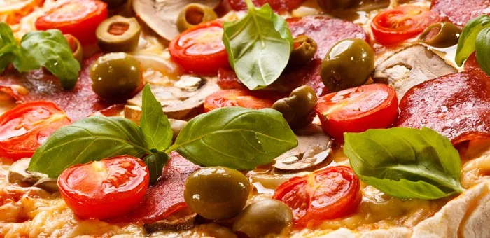6. Dress the pizza with a thin layer of sauce, add the toppings, and bake for about 25 minutes, until the dough is golden brown and pulls away from the edges.